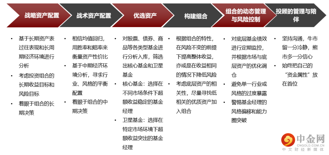 在主理人在主动管理组合的过程中,基金组合的构建实际上是一个复杂的体系。包括自上而下中长期维度的战略资产配置和偏短期维度的战术资产配置、“定量+定性”的基金筛选流程、组合构建后的动态管理和风险控制以及组合主理人的管理与陪伴。在以后的文章中,我们也会对其中的每一步给大家做一个详细的拆解。