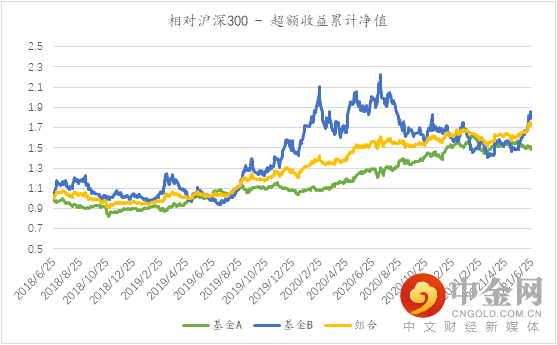 基金组合的业绩曲线也许不是最快的,但他相对是最稳的。我们分别计算两只基金和组合相对沪深300的超额收益情况(基金(组合)每日收益率-沪深300每日收益率,然后累加),可以看到组合的超额收益在过去三年中稳定向上,就如同一条安全带,在市场出现剧烈的波动时,给投资者一份持有的安全感。