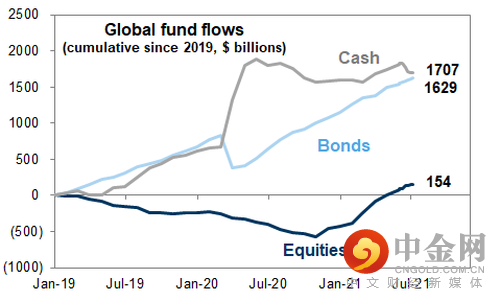 全球资金流入股市是今年最大的主线,但拉长时间来看,这似乎并不极端,场外现金在等待逢低买入。