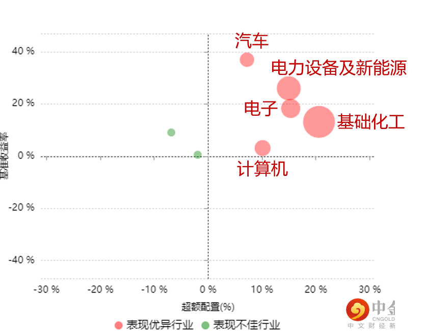 以姚志鹏管理的嘉实智能汽车为例,通过归因分析对收益进行拆解,可以看出姚志鹏在几乎所有行业上都取得了超额收益,而且总体上重配的行业超额收益更明显,具体见下图红圈部分。