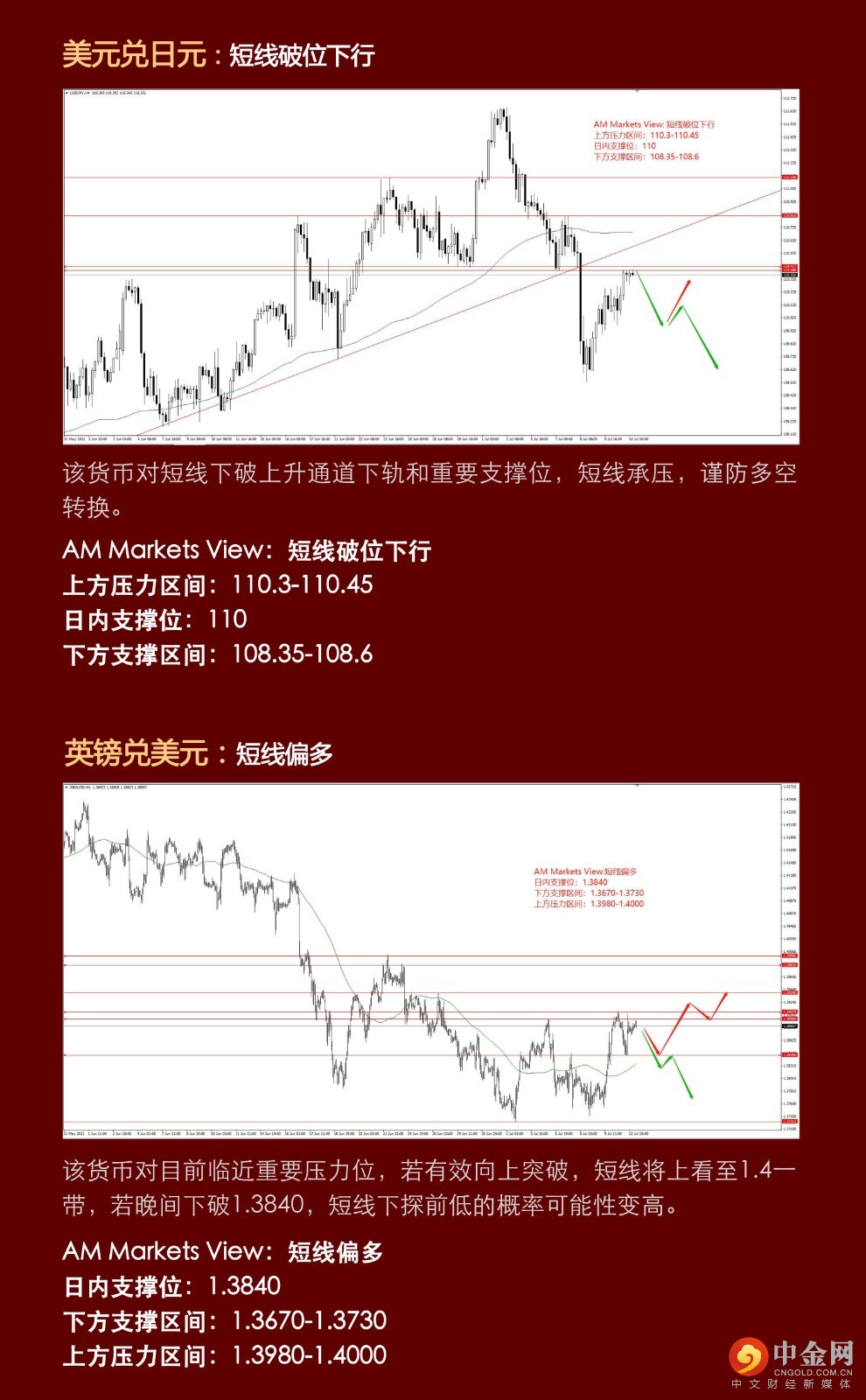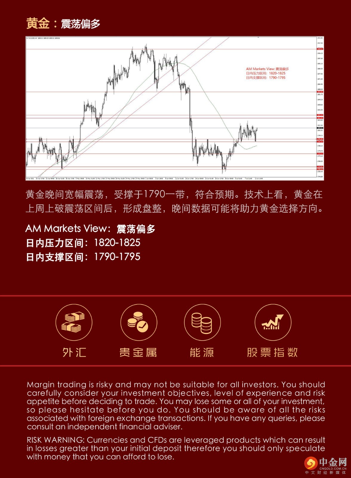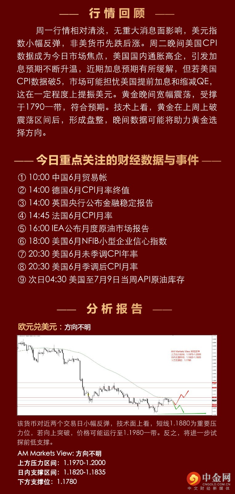 周一行情相对清淡,无重大消息面影响,美元指数小幅反弹,非美货币先跌后涨。周二晚间美国CPI数据成为今日市场焦点,美国国内通胀高企,引发加息预期不断升温,近期加息预期有所缓解,但若美国CPI数据破5,市场可能担忧美国提前加息和缩减QE,这在一定程度上提振美元。黄金晚间宽幅震荡,受撑于1790一带,符合预期。技术上看,黄金在上周上破震荡区间后,形成盘整,晚间数据可能将助力黄金选择方向。