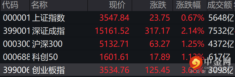 截至收盘,沪指涨0.67%报3547.84点,深成指涨2.14%报15161.52点,创业板指涨3.68%报3534.76点,已逼近沪指,仅相差13点。