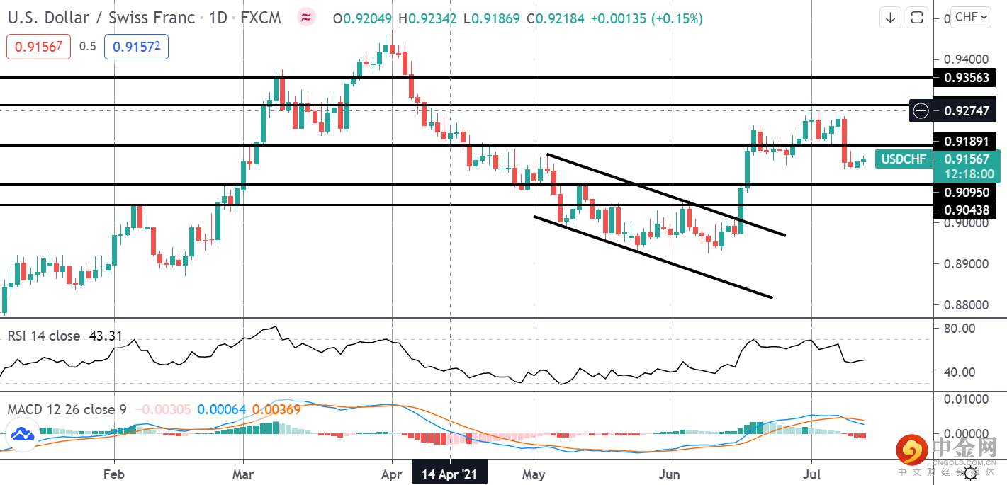 突破 0.9043 水平后,价格交易高至 0.9271,然后回落。虽然 MACD 和 RSI 均已转低,但今天任何数据仍有新的上涨空间,可能会看到该货币对再次突破上行。在 0.9189 上方寻找新的多头,目标是 0.9288 和 0.9356。