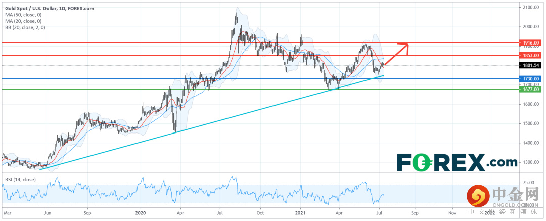 看涨的投资者可将1,730美元视为主要支持(止损)位,反弹目标在1,853美元及1,916美元。