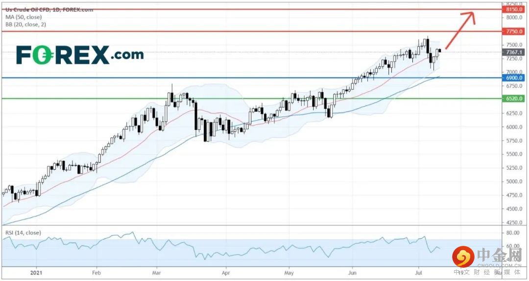 相对强弱指数仍高于中性水平50,表明美国原油CFD缺乏下行动力。因此,技术格局短期仍以看涨为主调。