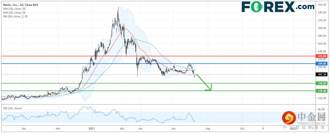 在日线图上,百度的技术走势开始转弱。此前,它反弹失败并再次回到20日及50日移动均线的下方,相对强弱指标亦处于弱势。