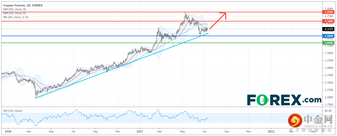 从技术角度看,如日线图所示,芝商所铜期货的长线上升趋势依然稳健。此前价格的下滑并没有破坏去年3月以来的上升趋势线。目前,价格已回到20日移动均线的上方。