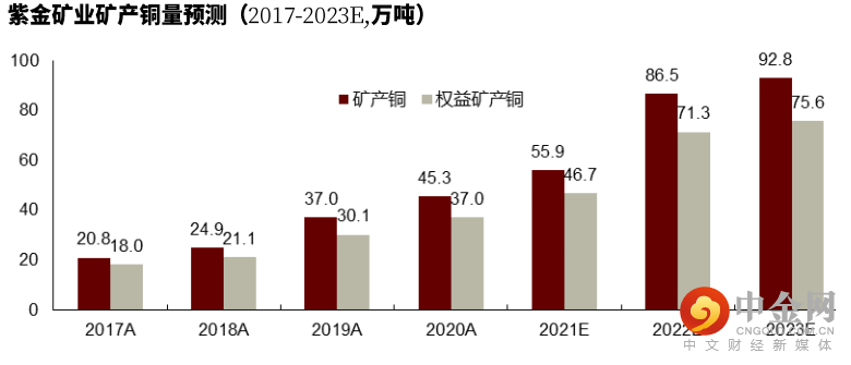 中信证券表示,紫金矿业掌握全球核心矿业资产,并快速进入资源效益转化期,预计未来十年维度将迎来持续性的增长,矿端增量将对冲价格波动对利润的影响。维持紫金矿业2021年-2023年归母净利润预测分别为130.8亿元、174.8亿元、193.8亿元,对应每股收益预测分别为0.51元、0.69元、0.76元,给予紫金矿业未来一年目标价21元每股。