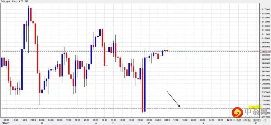 短期间可以部署在$1,793美元左右建立好仓盘,短线看高金价一线至$1,820美元水平止损在$1,785美元。