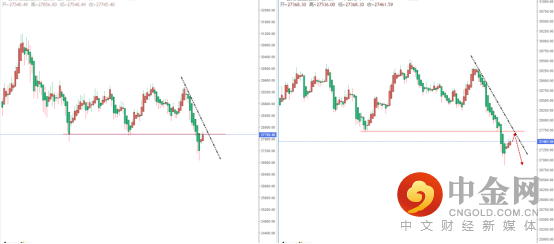 恒生指数天图:目前行情在持续下行后,短期也进入反弹阶段中。但整体趋势依然处于在空头阶段,上方有下降趋势线的压制作用,其水平压制带在27831.95附近。从日内4小时级别,可适当关注价格回测上方压制区域的表现,如果继续受阻则可保持空头方向。反之,其趋势将继续向上反弹。