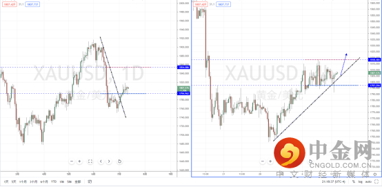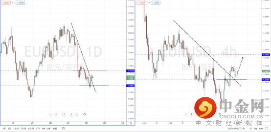 欧美天图:目前行情在下方支撑区域筑底成立后企稳上行,并且价格有效突破下降趋势线的压制作用。但由于美元指数的纠结反复,欧美短期趋势动能尚缺。从日内4小时级别,价格在突破下降趋势线后也进行反压回测后企稳。可适当关注价格调整后上行的多头机会,其目标位置参考1.19076附近。