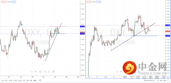 美元指数天图:目前行情继续在高位区间受阻,上方水平压制带在92.793附近。虽然短期价格有跌破上升趋势线,但一直处于在关键支撑区域徘徊。从日内4小时级别,价格在反压回测后受阻,由于下方空头空间幅度有限。不宜追空行情,可关注趋势调整破位的空头机会,下方目标位置参考91.850附近。