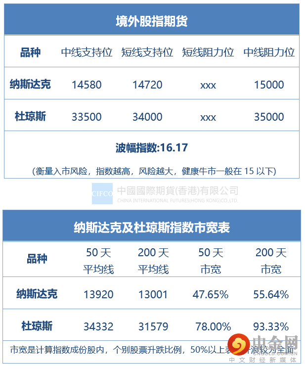 纳指目前支持位14625支持, 15000点是心理阻力区, 杜指若突破35000点, 有机会再有1%升幅。