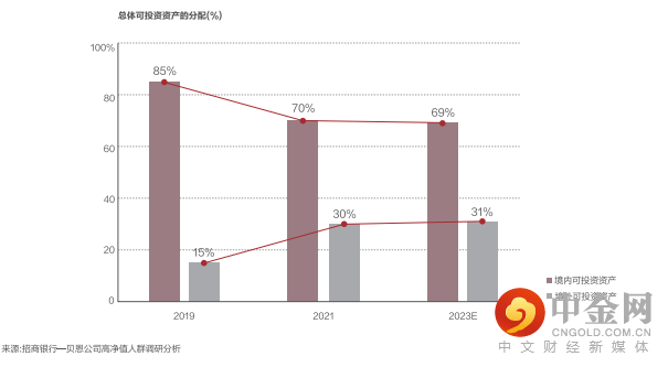 从2019年至2021年的高淨值人群境内外资产配置比例可以看到,现时中国高净值人群整体境外资产配置比例呈现三七开的原则,境外可投资资产比例升至30%,预计未来境内外资产配置比例会保持稳定。