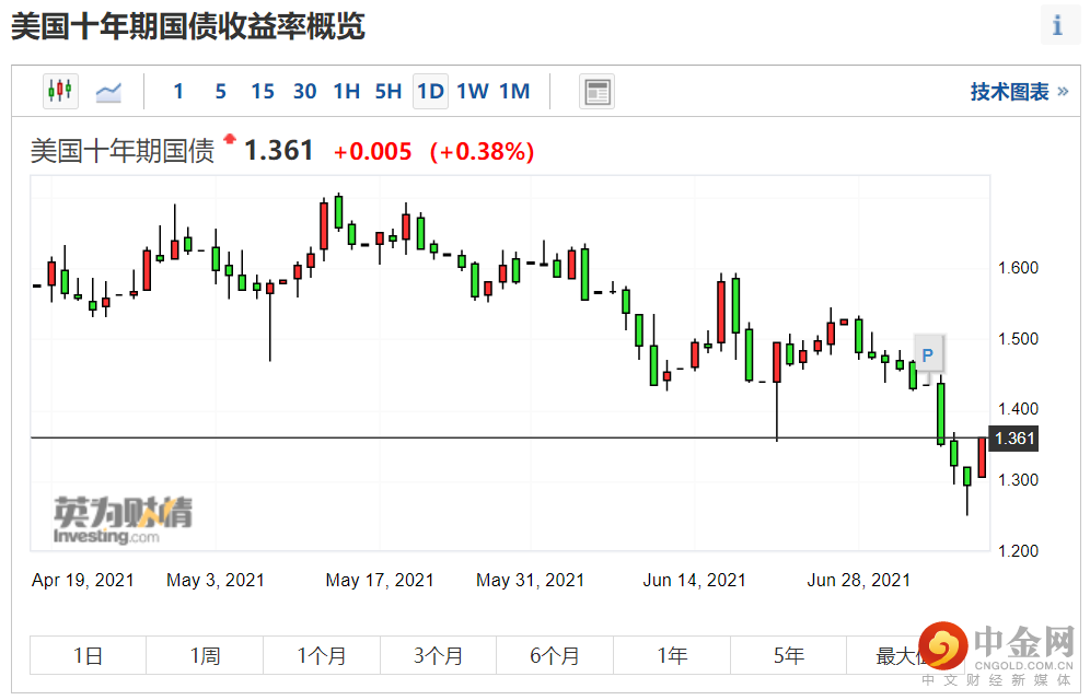 7月8日,美国10年期国债收益率更是一度跌破1.3%重要关口,最低触及1.25%,创2月以来新低,最终收盘在1.2945%,依然处于1.3%之下。次日有所反弹,收复了1.3%的重要关口,令市场稍稍松了一口气。