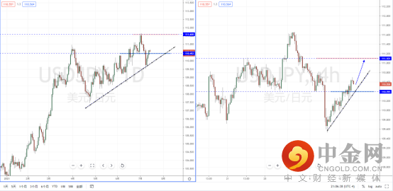 美日天图:短期价格在关键位置附近反转后继续上行,并且在下方支撑带附近形成新的支撑节点。下方有上升趋势线的支撑作用,其水平支撑带在110.452附近。从日内4小时级别,价格有效突破水平压制带上行。可适当关注价格调整后的堵头机会,上方区间目标位置参考111.101一带。
