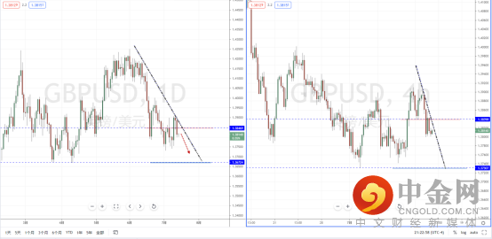 镑美天图:目前行情在上升冲击过程中继续受阻下探,并且形成新的压制作用。其上方水平压制带在1.38469附近,又有下降趋势线。从日内4小时级别,价格在受阻节点附近承压,可适当关注价格调整后继续走弱的空头机会,下方目标位置参考1.37307附近,但需要注意空间幅度。