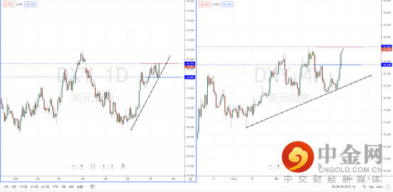 美元指数天图:短期价格关键支撑带92.095附近极端反弹上行,并且再次冲击上方压制区域,下方又有上升趋势线的支撑作用。从现阶段行情依然处于在多头阶段,在4小时级别中。由于趋势上冲力度较强,并且处于短期压制附近,不宜追多。可适当关注价格调整后继续上行的多头机会,上方目标位置参考前期高点附近。