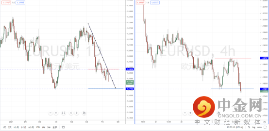 欧美天图:目前行情因受到美元指数在关键位置附近的反转,使得欧美在趋势节点附近再次破位。现阶段整体行情继续处于在空头阶段中,上方有下降趋势线的压制作用,其水平压制带在1.18558附近。从日内4小时级别,价格在下行过程中触及短期支撑。可适当关注价格调整后继续下行的空头机会,下方区间目标位置参考1.17102一带。