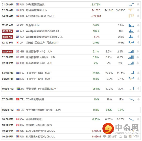 2021-07-13 01:30 AM 澳大利亚 - 商业信心指数 Jun 11,目前数据继续走弱,属于利空。2021-07-13 12:30 PM 美国 - 通货膨胀率 Jun 5.4%,目前数据持续增长,属于利多。