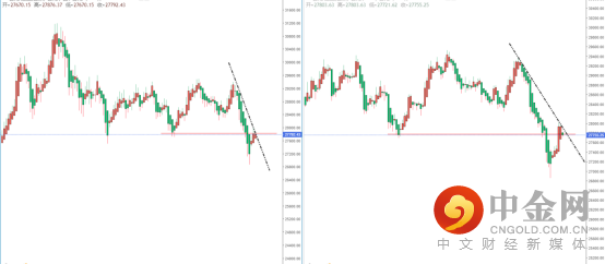 恒生指数天图:目前行情继续在关键趋势节点附近受阻,上方有下降趋势线的压制作用,其水平压制带在27876.89附近。从日内4小时级别,价格也处于在回测之中,可适当关注价格此区间的表现。如果承压受阻则继续关注空头机会,下方目标位置参考前期低点附近。