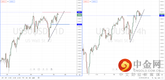 道琼斯指数:目前行情继续处于在高位多头阶段中,下方有上升趋势线的支撑作用,其水平支撑带在34172.8一带。短期趋势在上方区域徘徊,不宜追多行情。从日内4小时级别,可适度关注价格回测下方多重支撑区域附近的表现。如果起稳可继续尝试多头机会,但需要注意上方空间幅度。