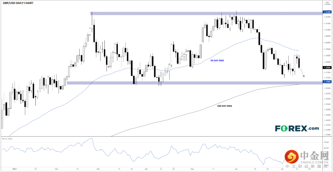 我们来看英镑/美元。昨天逼近50天指数移动均线后调头,在美国通胀压力继续升级的背景下,看跌交易者本周可能着力于推动该货币对下探1.3700一线中轨的上周低点,甚或1.3700附近的半年低点(兼200天指数移动均线)。