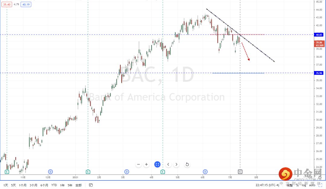 BAC:目前行情整体趋势处于在高位区间徘徊后受阻,并且在短期市场数据不利的前期下,加速下行。整体格局处于在空头阶段中,上方水平压制带在40.83附近,又有下降趋势线的压制作用。可适当关注价格价格调整后继续下行的空头机会,下方目标位置参考35.96附近。