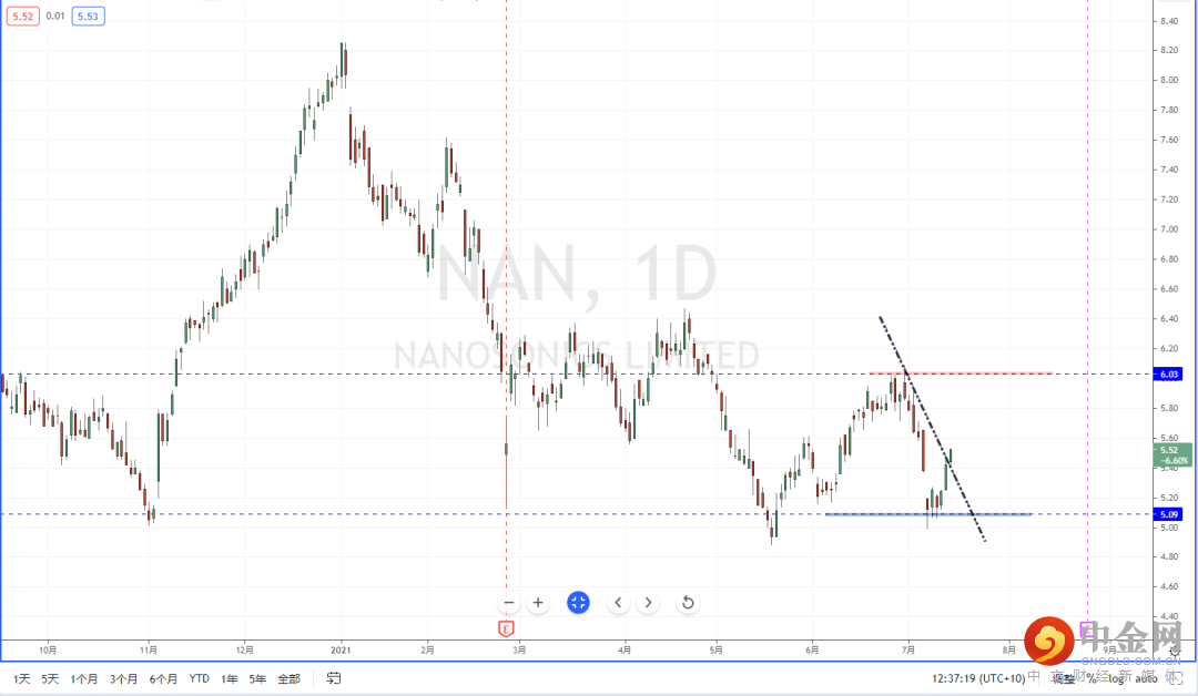 NAN:短期市场再次受相关政策影响,在原本以分化的产业之中继续加剧,其弱势产业则继续走弱,相对保持强势的产业则继续上行。从NAN目前整体趋势的表现,在测试下方水平支撑带5.09区域后止跌起稳上行,并且短期价格也一度突破下降趋势线的压制作用。近期可适当关注价格调整后继续向上的多头机会,上方区间目标位置参考6.03附近。