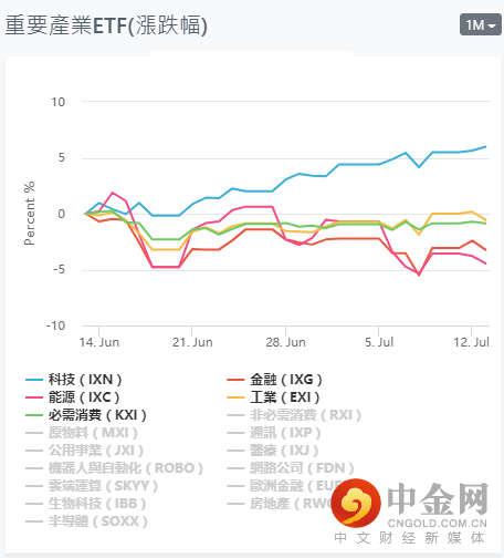 近期随着市场相关数据的影响,在美国6月CPI超预期增长,美国通胀压力仍然较大的前提下,美国三大指数集体从高位回落,跌幅均在0.3%左右,其中金融板下行幅度较大。从ETF的产业走势的表现,科技类产业依旧处于在领涨阶段中,其它ETF产业的表现在弱势阶段下,继续走弱。短期关注:科技(IXN),工业(EXI),必须消费(KXI),原物料(MXI),公用事业(JXI),房地产(RWO)等产业中个股的多头机会。