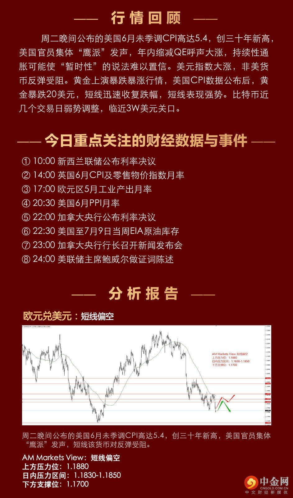 周二晚间公布的美国6月未季调CPI高达5.4,创三十年新高,美国官员集体“鹰派”发声,年内缩减QE呼声大涨,持续性通胀可能使“暂时性”的说法难以置信。美元指数大涨,非美货币反弹受阻。黄金上演暴跌暴涨行情,美国CPI数据公布后,黄金暴跌20美元,短线迅速收复跌幅,短线表现强势。比特币近几个交易日弱势调整,临近3W美元关口。
