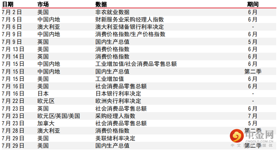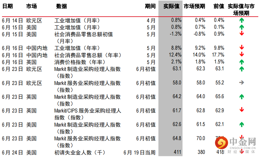 注:↑高于预期——实际值高于市场预期,↓低于预期——实际值低于市场预期,→实际值符合市场预期。