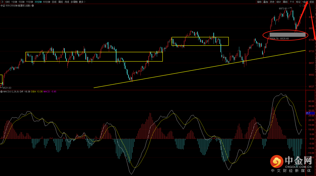 中证500盘中试探到了前期跳空缺口,短期谨慎追高,一旦有出现再次的新高需要注意可能再次出顶背驰结构,届时就可能再次回落回补前期跳空缺口。目前中证500在做新的上升中枢结构,后续在没有出现下降中枢之前大概率在回补缺口后还有再次的上升。