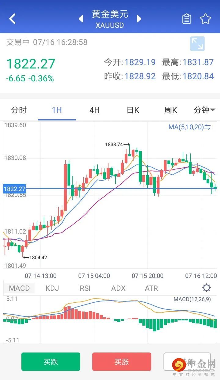 周四现货黄金窄幅交投,欧盘初一度站上1830美元/盎司,为6月16日以来首次,但不久后从高点回落,最终收涨0.11%,报1828.92美元/盎司。本交易日亚盘初,现货黄金暂小幅回调。日内黄金失去了前期的上涨锐气,从1小时走势图来看,绿色动能柱延续,空头在继续发力。但由于美联储继续维持宽松货币政策,以促进经济复苏,金价料连续第四周收涨。