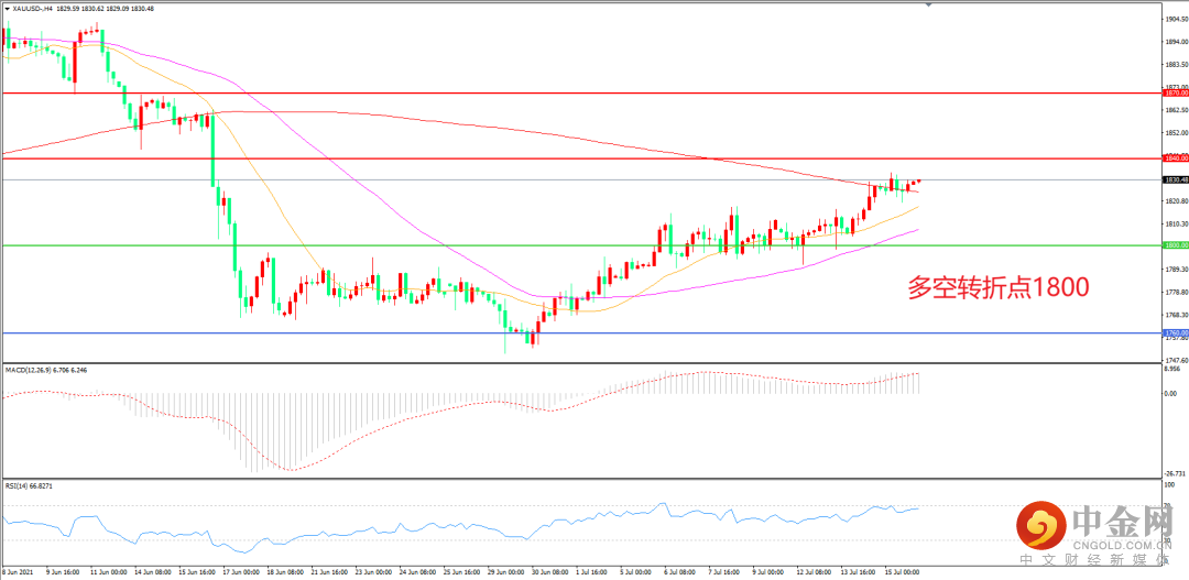 4小时图看,金价突破前期阻力后震荡拉升,短线表现较强,短期均线呈多头排列,1800成为多空分水岭,MACD红柱增加,RSI指标走平,日内震荡向上概率较大。