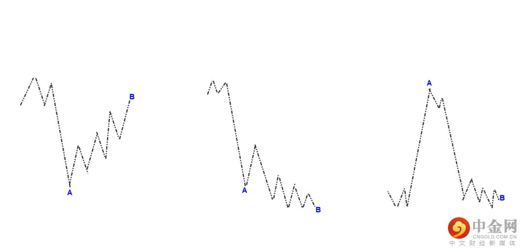 第一个图形状态:一个突降至A点的波动,有一个基本面的理由,被夸大了,因此价格部分地反抽回B点位置。