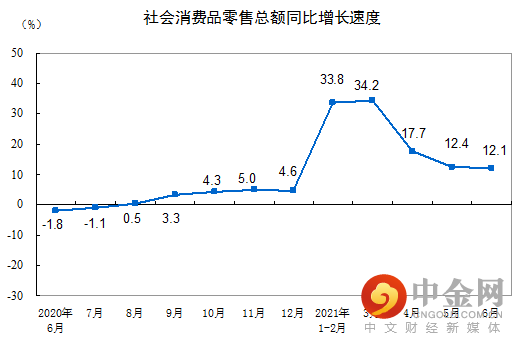 6月份,社会消费品零售总额37586亿元,同比增长12.1%;比2019年6月份增长10.0%,两年平均增速为4.9%。其中,除汽车以外的消费品零售额33719亿元,增长13.1%。扣除价格因素,2021年6月份社会消费品零售总额实际增长9.8%,两年平均增长3.2%。从环比看,6月份社会消费品零售总额增长0.7%。