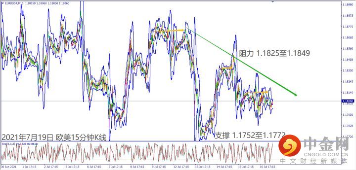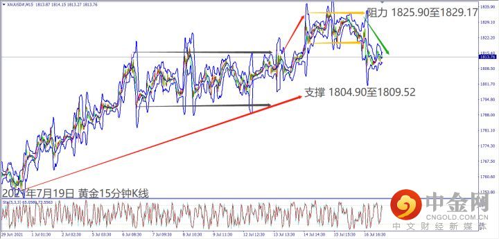 日级别线图,延续盘涨走势,短线在1820美元附近震荡,有望挑战240日均线;15分钟K线,上周出现箱型反转,守住7月盘整支撑,大有可能挑战箱形阻力。