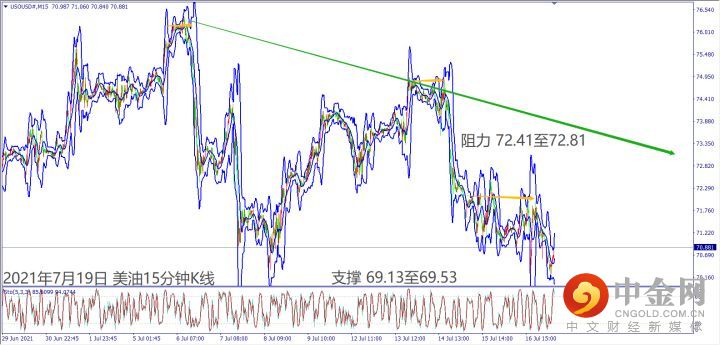 日级别线图,出现圆形顶反转,短均线下弯形成反压,一旦跌破70美元可能回测60日均线;15分钟K线,近期处于盘跌走势,下降趋势线反压冲不过,恐怕下探新低支撑。