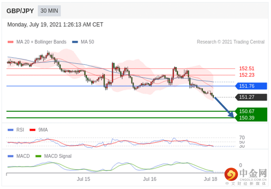 向上突破 151.76 ,将带来继续上行的趋势,目标位定在 152.23 和 152.51 。