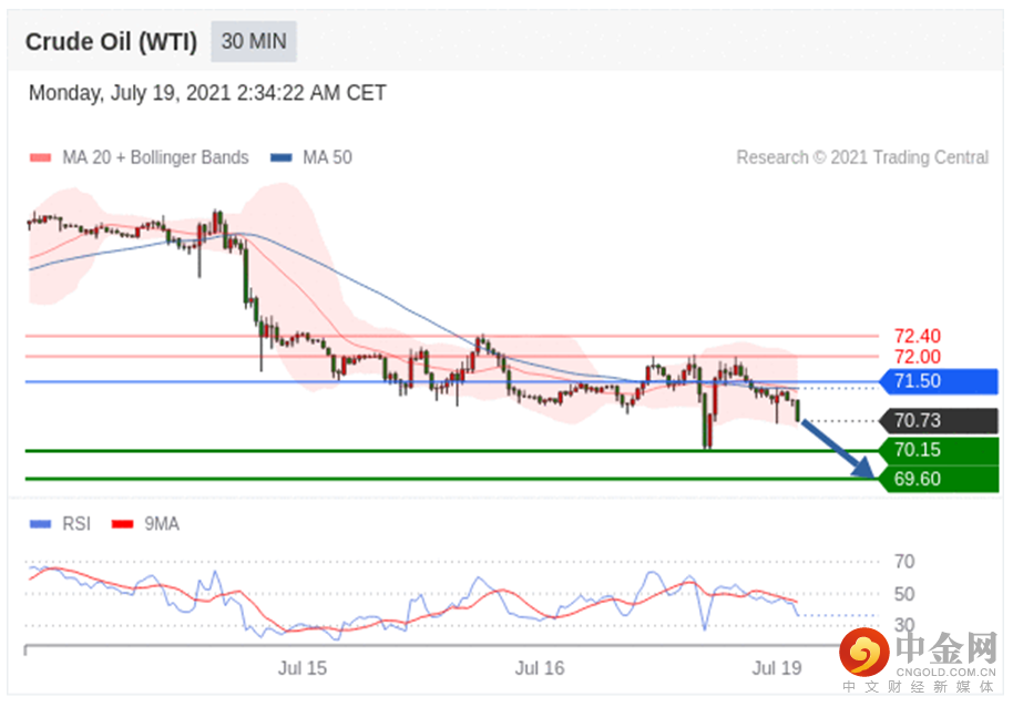 在 71.50 之下,看跌,目标价位为 70.15 ,然后为 69.60 。