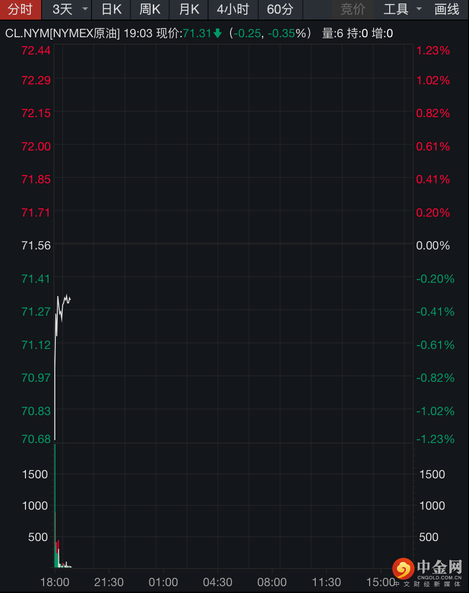 据Wind数据,7月19日亚市早盘,NYMEX原油期货主力合约低开1.23%,随后快速拉升,截至北京时间19日7:04,该合约跌幅为0.35%,报71.31美元/桶。