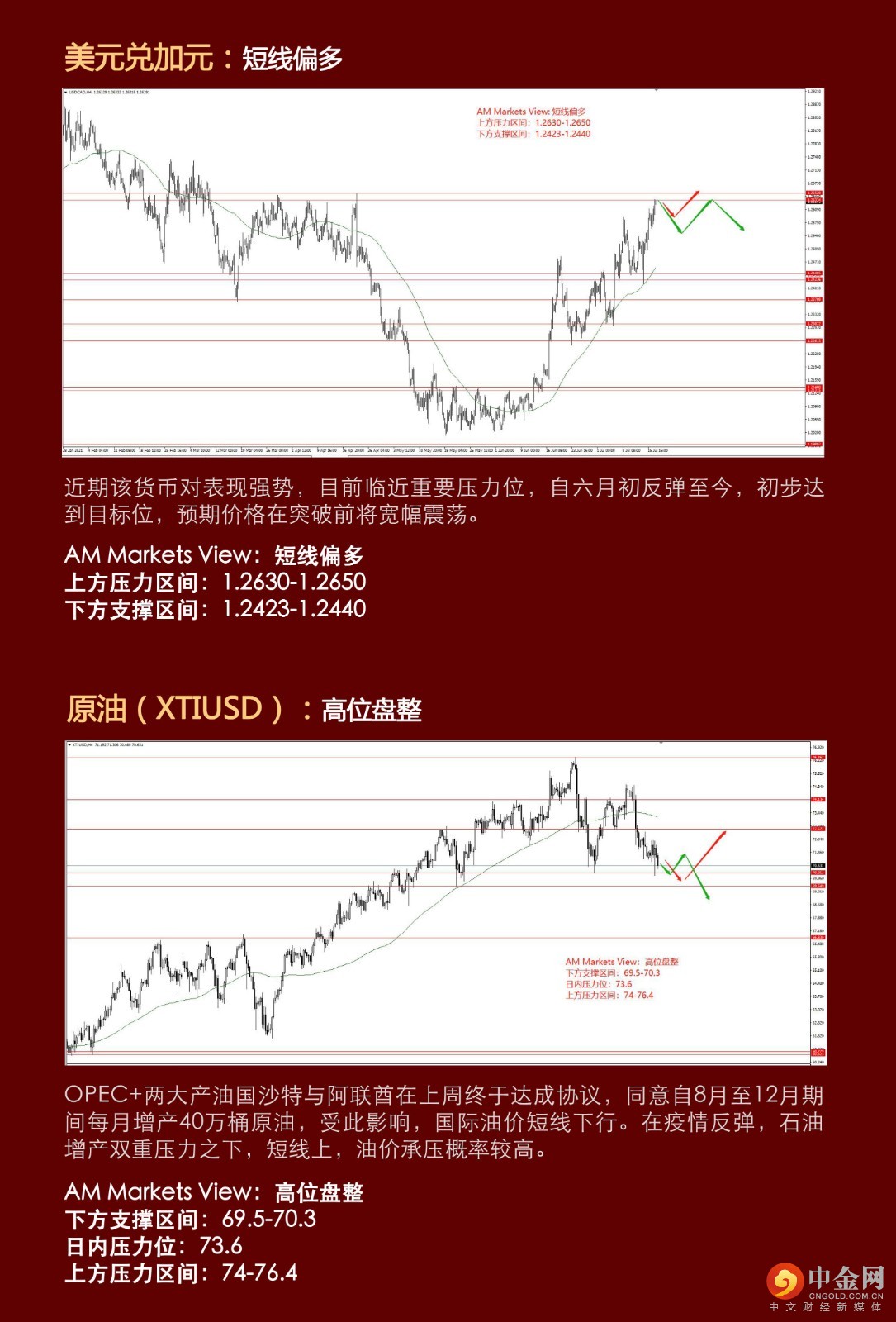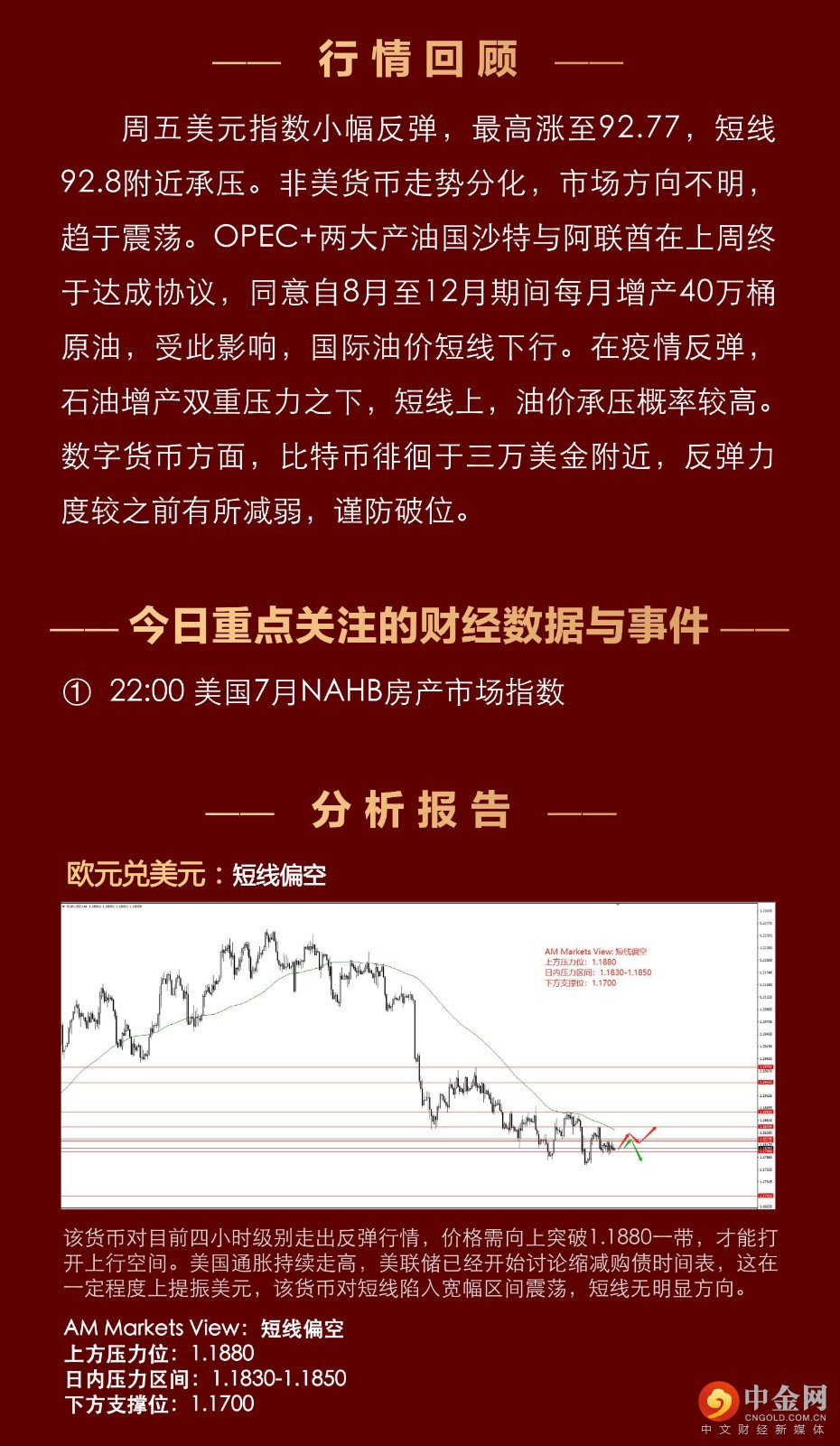 周五美元指数小幅反弹,最高涨至92.77,短线92.8附近承压。非美货币走势分化,市场方向不明,趋于震荡。OPEC+两大产油国沙特与阿联酋在上周终于达成协议,同意自8月至12月期间每月增产40万桶原油,受此影响,国际油价短线下行。在疫情反弹,石油增产双重压力之下,短线上,油价承压概率较高。数字货币方面,比特币徘徊于三万美金附近,反弹力度较之前有所减弱,谨防破位。