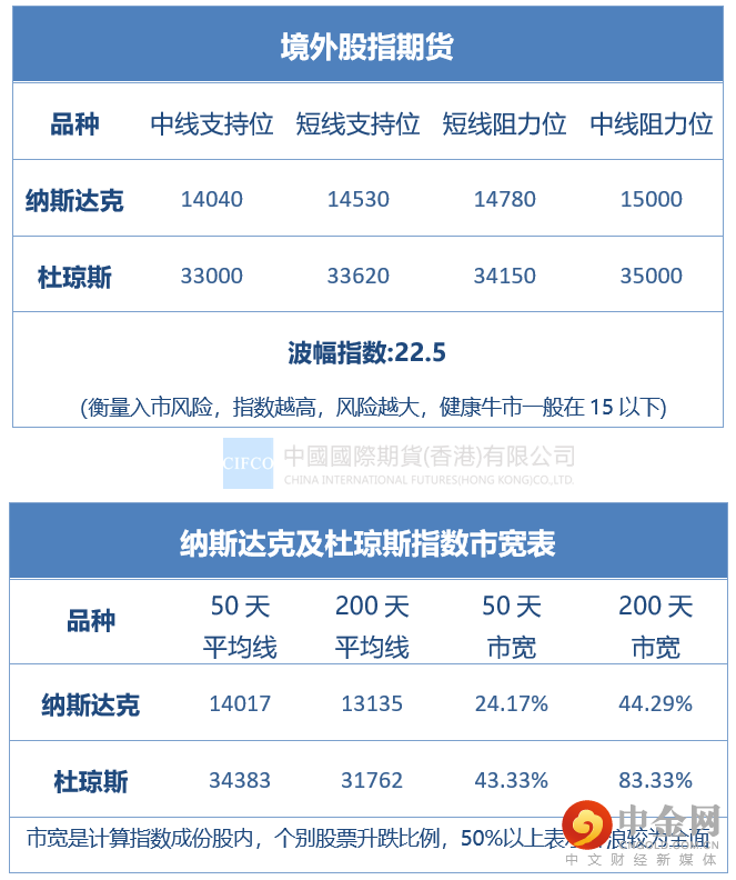 由于杜指多次欲挑战35000点都失败而回,增加出现获利沽盘时的沽售压力,杜指的34000点重要支持亦已失守,这将加深调整时间。纳指表现虽然相对较强,但它亦有自身问题,50天市宽长时间低于50,只有24.17,反映目前支撑纳指升势主要来自大型科技公司,约80%纳指成份股股价早已低于50天平均线。
