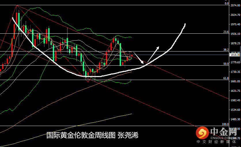 技术上,周线级别:金价本周触及中轨支撑后再度反弹走高,维持了近3周都在中轨及30周均线之内的运行的模式,反弹力度上虽有减弱,但附图指标KDJ及MACD正处于空头力量缩减阶段,主图上,50%回撤线和100周均线有较强支撑,再结合自2075美元高点而下到目前的整体走势,有走出圆弧底形态的行情,故此金价后市有重回两千关口附近的预期和空间。