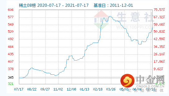横盘已久的稀土板块为何突然大涨?其中最直接的催化剂是稀土价格回升。继阶段性触底(2021 年6月)之后,稀土价格迎来连续多日回升。截止7月2日,轻稀土镨钕氧化物、金属均价分别为54.35、66.75 万元/吨,较底部上涨16%、17%;重稀土方面,氧化镝、铽均价分别为244、663万元/吨,分别底部上涨6%、7%。同时,生意社数据显示,7月16日稀土指数为540点,较上日上升了13点,近期累计反弹接近20%。