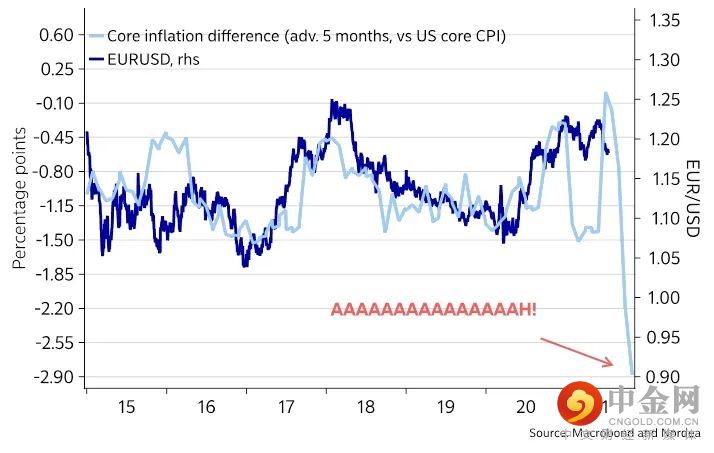 “美国与欧元区核心通胀率之差处于历史高位,这可能预示美元走强。”北欧联合银行解释道,当美国核心通胀率意外上升,而欧元区通胀率下降,这会导致美联储与欧洲央行之间的政策差异扩大。策略师认为,这在2021年下半年似乎也很有可能发生,尤其是拉加德已经公开暗示,欧洲央行本周将巩固前瞻指引。