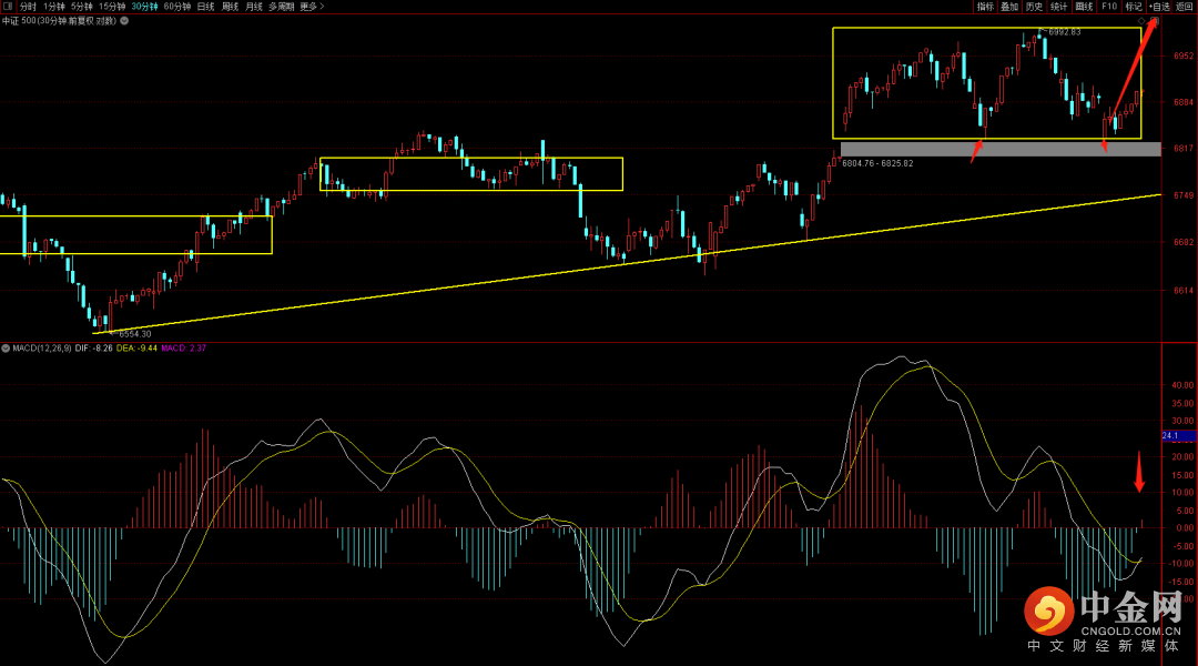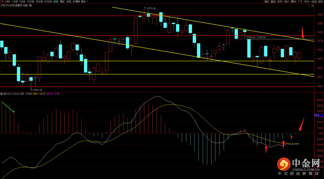 沪深300前期已经连续三次出现macd扩张走势,大概率不会再出现第四次,且目前所处的位置刚好在支撑趋势线上,短期关注是否能够出现放量突破5135一旦突破有望回补前期的跳空缺口。