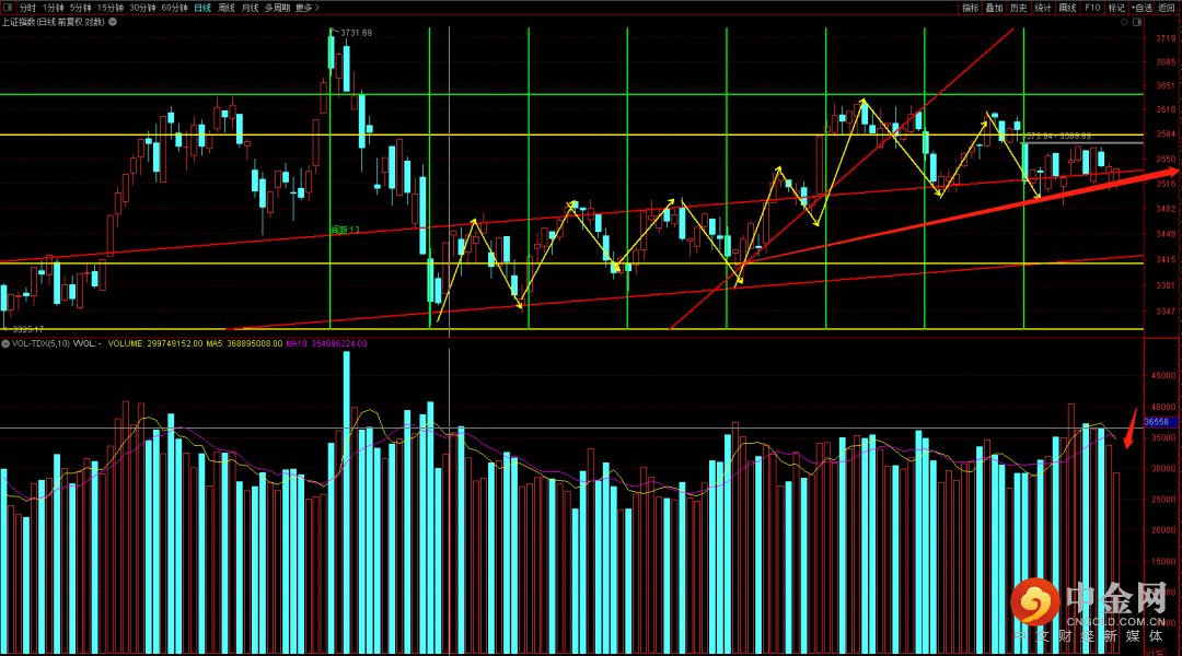 大盘连续两天出现低开向上回补缺口,周二收出了地量,短期下跌空间相对有限,而变盘窗口将在周三出现短期注意是否能够突破3569点压制回补缺口。关注突破量能是否放大,短期关注macd是否出现收敛一旦再次出现收敛大概率会开始向上走上升趋势。从目前结构看跟五月的时候走势有点类似,关注是否在未来几天出现突破阳线。