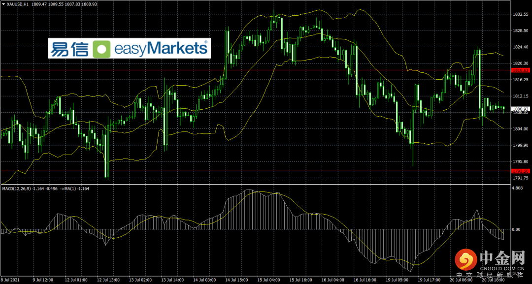 技术上黄金上方1818美元附近关键压力,突破看1824美元附近,支撑是1805美元,1800美元,1795美元。指标看布林线开口略向下,MACD在0轴附近震荡。交易策略,鉴于上下方位置重要性,投资人避免突破前追单,可以尝试高抛低吸交易,突破则反手追单。